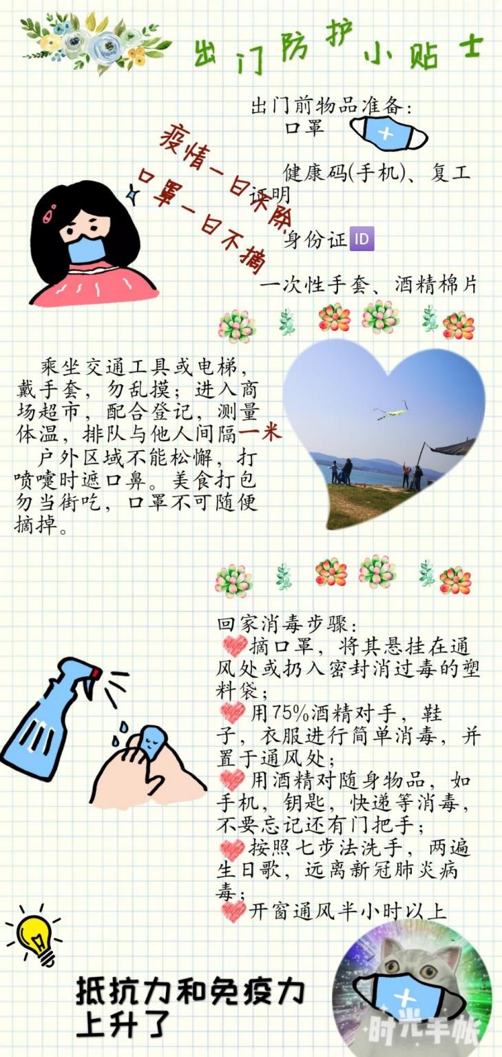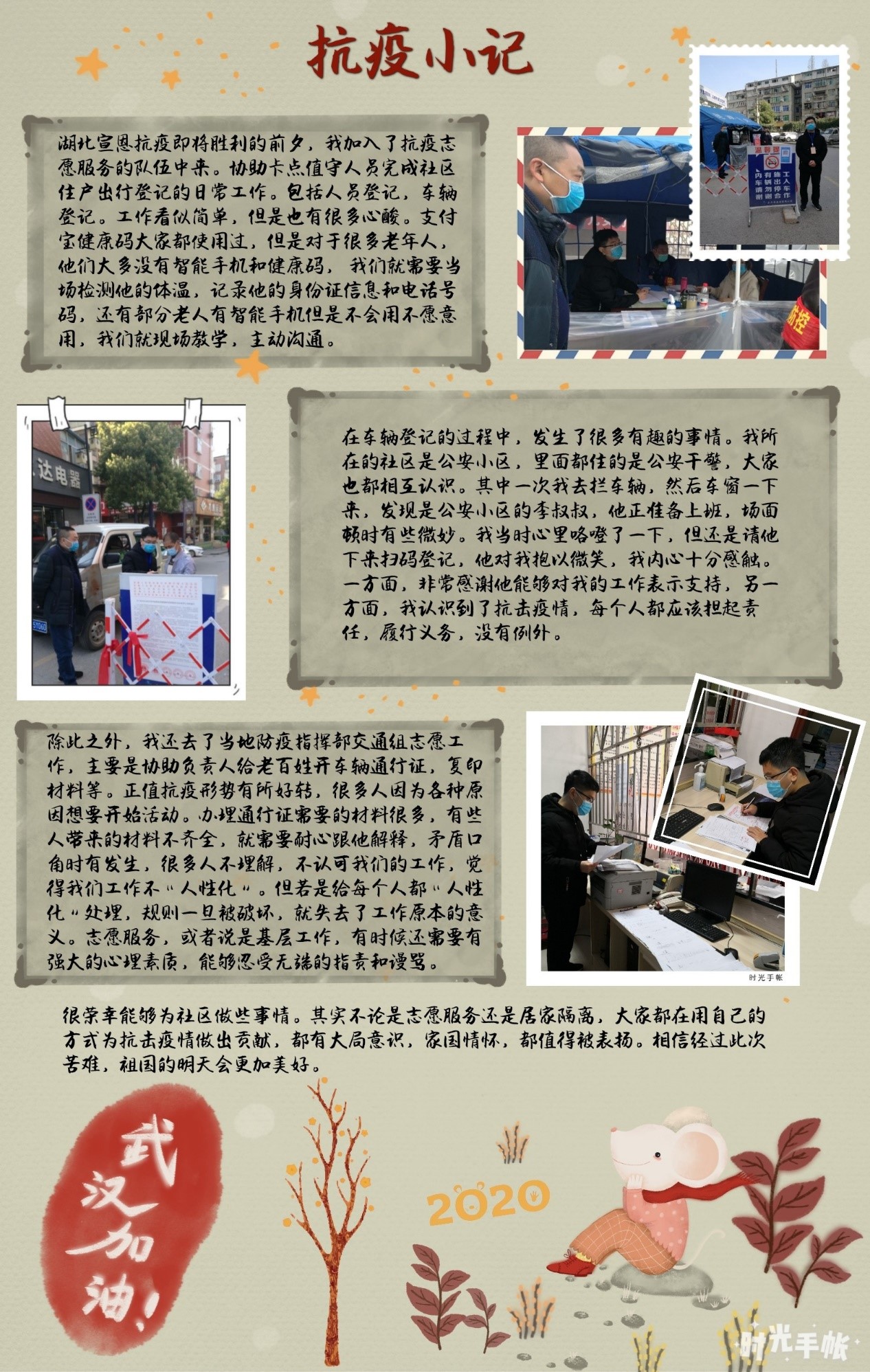 【防疫类手账展示】防疫有我敢为先。尚才杰同志向大家分享了自己参加抗疫志愿服务的经历,其中包括协助卡点值守人员完成社区住户出行登记的日常工作,以及协助负责人给老百姓开车辆通行证,复印材料等。雷雨婷同志向大家分享了关于特殊时期,大家在出门前需要准备的一些物品清单以及回家消毒的详细步骤。索萌同志分享自己在疫情期间的一些经历,其中包括自己大年三十还在医院隔离的经历以及自己在家乡防疫点做出的一些志愿活动。