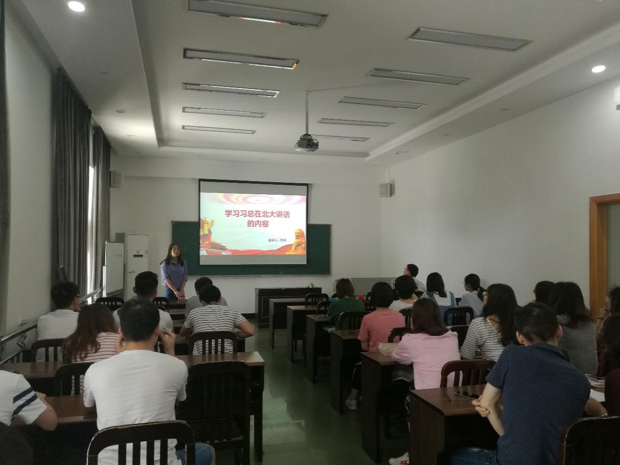 2016级硕士一班党支部书记杜可首先对习近平总书记在北大的讲话内容做了简单介绍并强调了其重要意义,紧接着对社会主义大学的“一个根本任务”即培养德智体美全面发展的社会主义接班人这个主题展开了互动,号召同学们进行了热烈的讨论。最后向大家强调了对青年提出的“四点希望”。