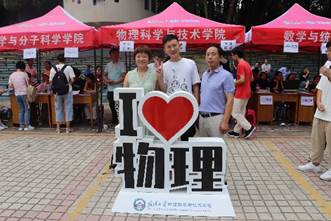值得一提的是,武汉大学党委书记韩进、校长窦贤康等校领导及党委研究生工作部、研究生院、校团委等相关职能部门负责人来到物院报到处,为新生带去学校的问候和祝福。校长对logo的设计赞叹不已,并与新生和工作人员合影留念。镜头定格了这温馨的一幕,在场师生无不欢欣激动,迎新场面也达到了高潮。