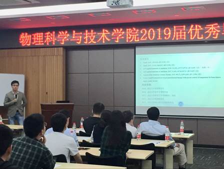 2019年4月23日晚六点半,我院在物理学院新楼五楼多功能厅举行2019届优秀毕业研究生评选展示活动。本次评选活动邀请到学院副院长陈志权教授、院长助理任峰教授、物理系副系主任蔡浩教授、党委副书记张一飞老师、学院学工办主任李顺彦老师,以及学生兼职辅导员龙云翔老师。本次活动由物理硕士一班王慧杰同学主持。
