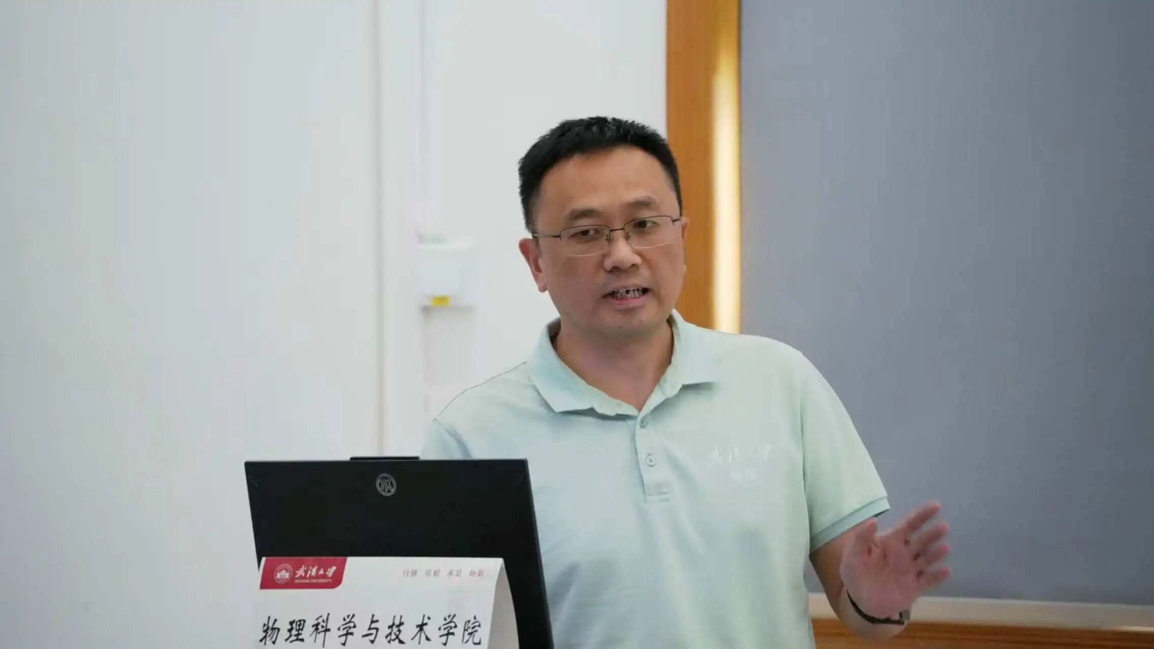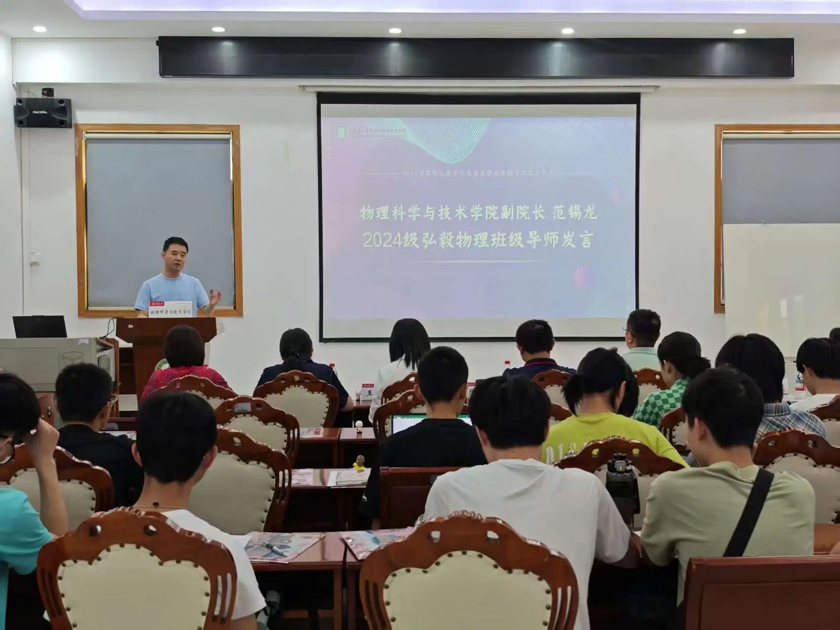 会议第三项由2024级物理弘毅班级导师、物理科学与技术学院副院长范锡龙老师发言,范老师结合自身科研与教学经历,勉励同学们要树立远大志向,保持对物理学科的热爱与探索精神。他表示将全力支持同学们的学业发展,为大家提供学术指导和成长帮助,希望同学们在物理学院度过充实而有意义的大学时光。