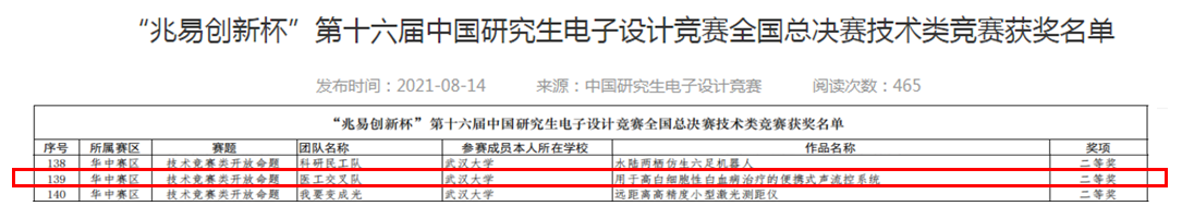 医工交叉队参赛的3位研究生分别是2019级博士夏宇、2021级博士(硕博连读)李娟和2019级硕士杜亮,参赛作品为“用于高白细胞性白血病治疗的便携式声流控系统”。团队成员经过了4个多月的精心准备,对参赛作品进行了反复修改、不断完善,同时克服了疫情的影响,较快适应了全国赛线上评审答辩的模式,最终在众多参赛队中脱颖而出,在获得华中赛区一等奖的基础上,再次出击全国比赛最终获得了二等奖。