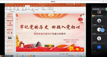 2020761930分,为庆祝中国共产党建党99周年,物理科学与技术学院物理二党支部的党员同学及积极分子通过腾讯会议组织召开了“牢记党的历史 回顾入党初心”的主题党日。本次活动围绕共产党的历史、支部同学回顾入党初心展开,支部书记唐庆航同学主持此次会议。
