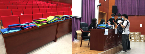 与此同时,物院报告厅这边的小伙伴也有条不紊的进行着核验双证与注册的工作。注册完成后,我们又为大家发放了防疫大礼包,里面包括两包口罩、体温计和免洗洗手液。