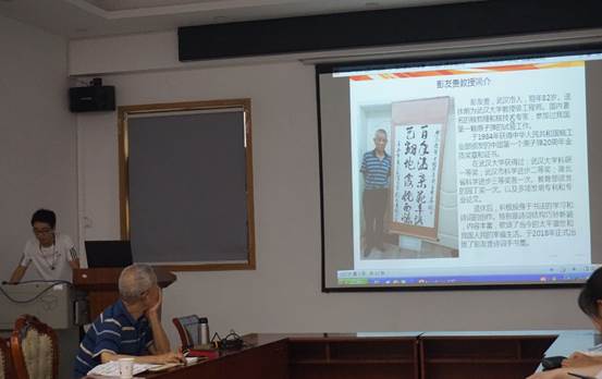 罗红泰同志首先对彭友贵教授进行介绍:彭友贵,武汉市人,1938年生。国内知名的核物理和核技术专家,参加过我国第一颗原子弹的试验工作,于1984年获得中华人民共和国核工业部颁发的中国第一个原子弹20周年金质奖章和证书。在武汉大学获得过武汉大学科研一等奖、武汉市科学进步二等奖和湖北省科学进步三等奖各一次,教育部颁发的园丁奖一次,以及多项发明专利和专业论文。