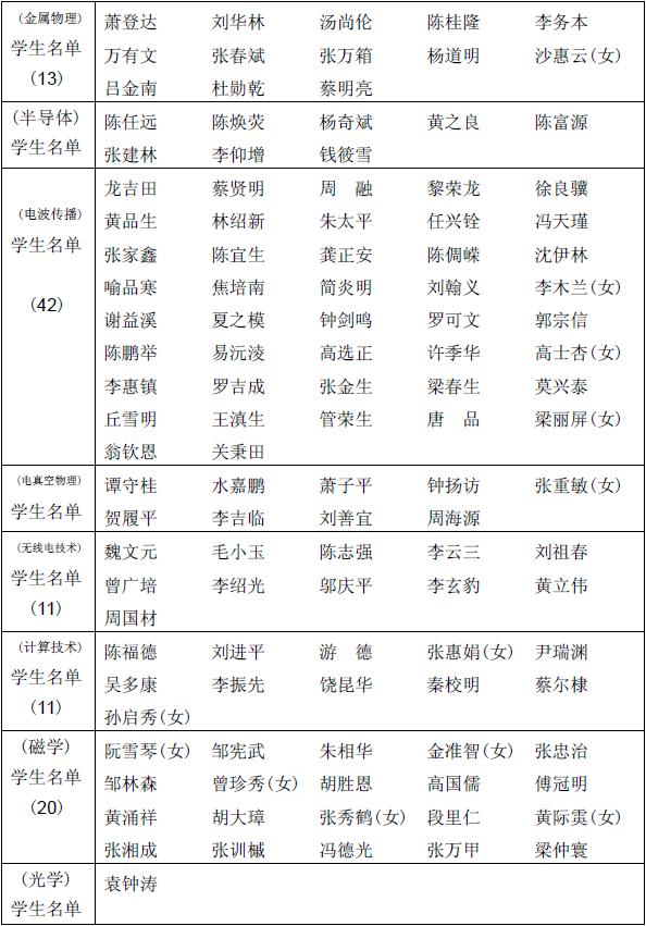 1962 届(1957~1962)物理学系/金属物理、半导体、电波传播、电真空物理、无线电 技术、计算技术、磁学、光学专业(五年制)